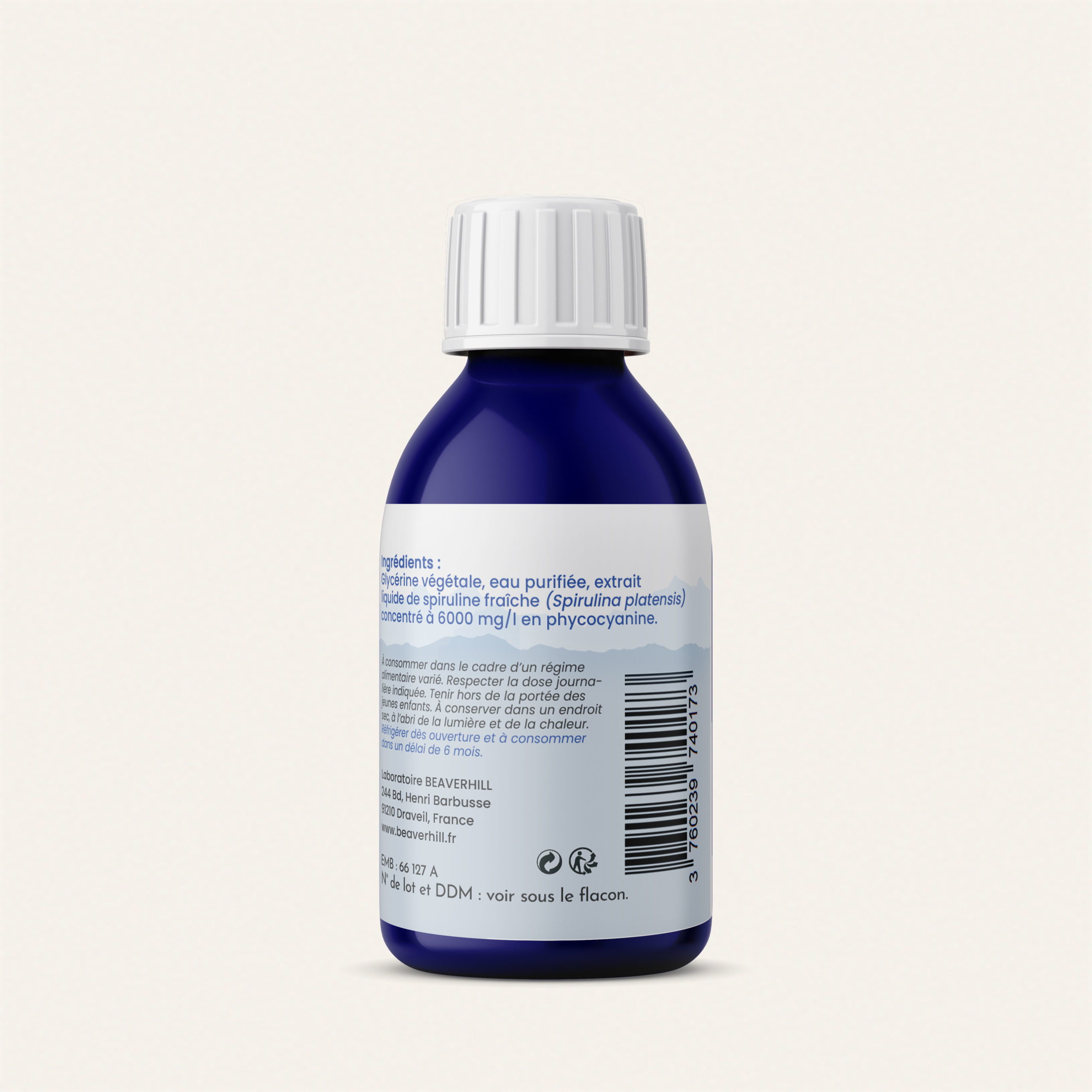 Glycérine végétale, eau purifiée, extrait liquide de spiruline fraîche (Spirulina platensis) concentré à 6000 mg/l en phycocyanine.