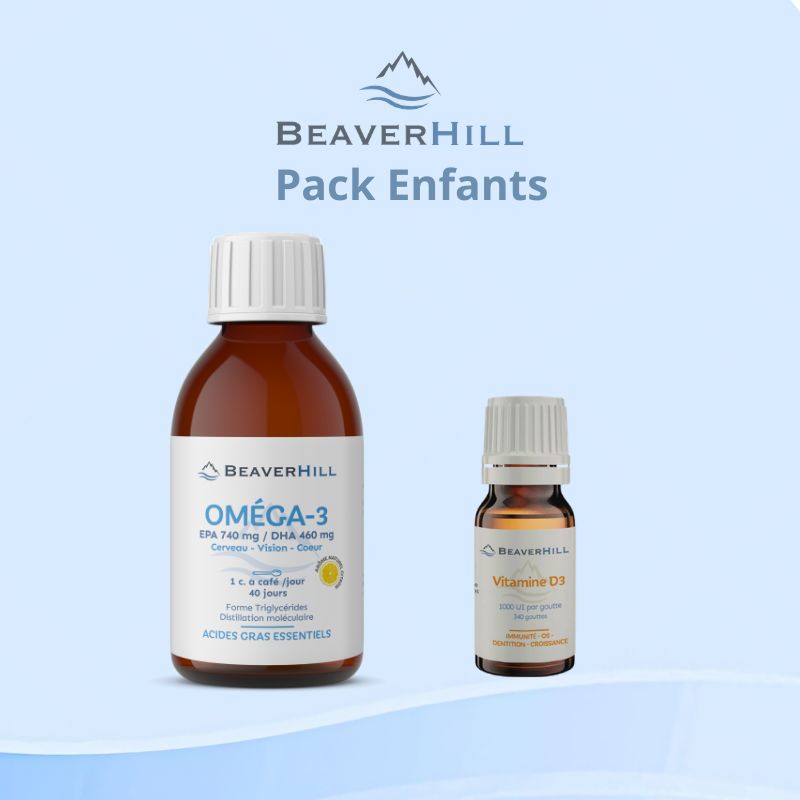 PACK Enfants composé de 2 références : Oméga 3 huile de poisson et Vitamine D3 en gouttes.