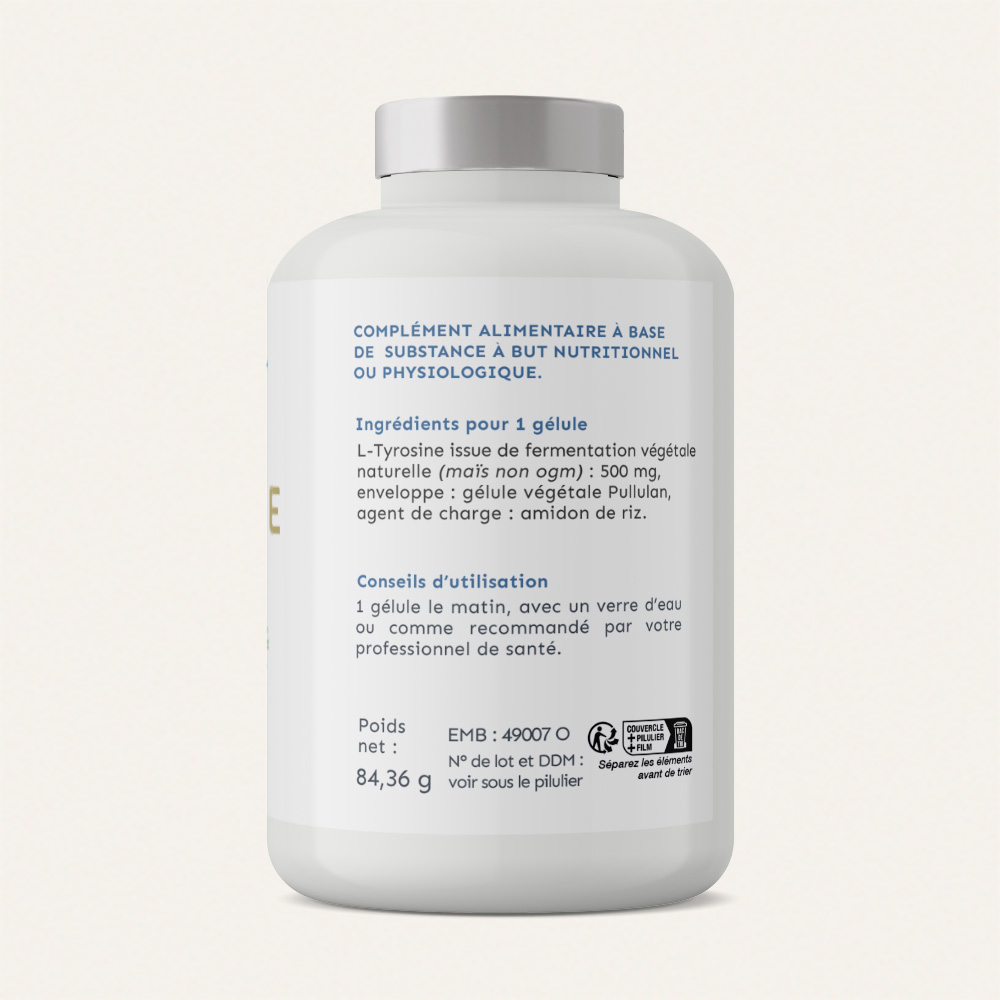 L-TYROSINE est de source naturelle issue de fermentation végétale (issu de la protéine de maïs non ogm).
